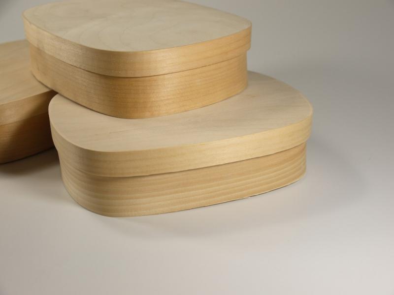 Fichtenspanschachteln: Boden und Deckel aus hellem Sperrholz. Die Seiten bestehen aus Fichten- bzw. Kieferspan.